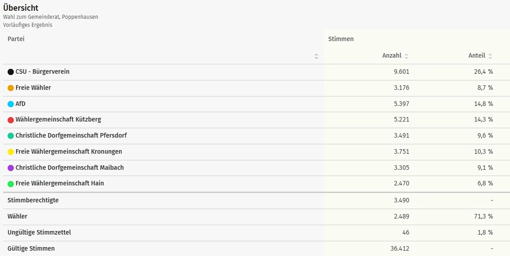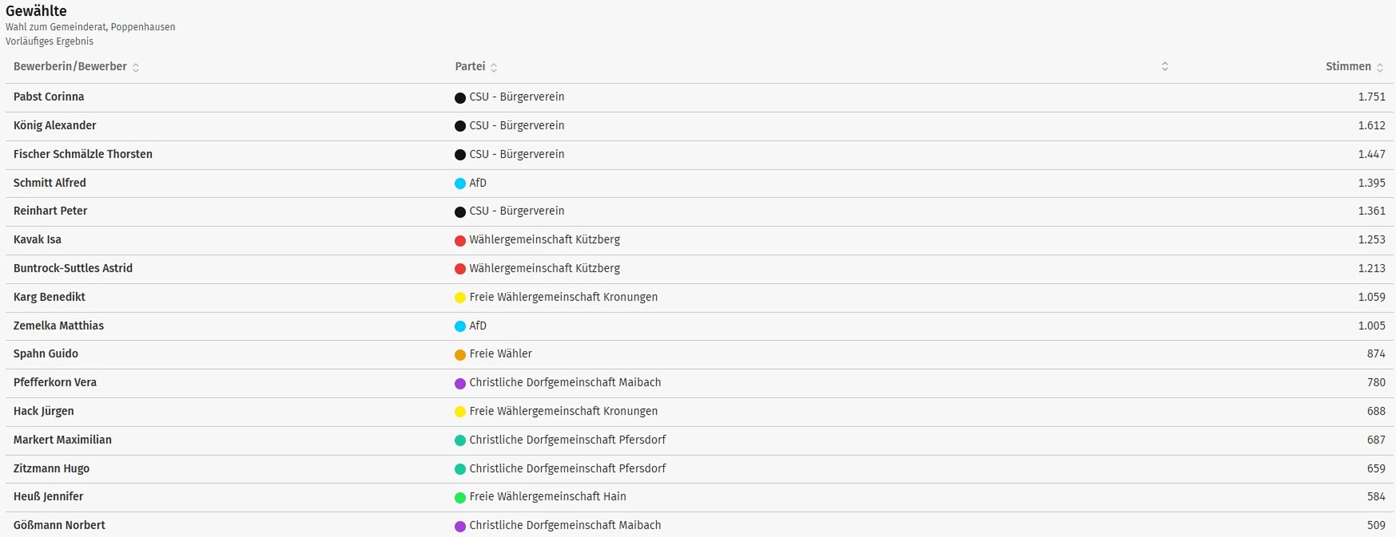 Ergebnisse der Wahl des Gemeinderates der Gemeinde Poppenhausen