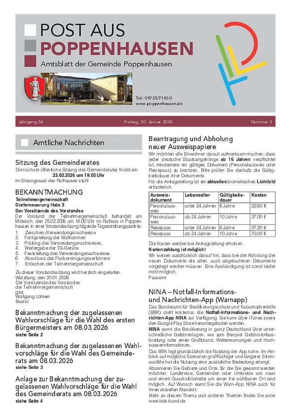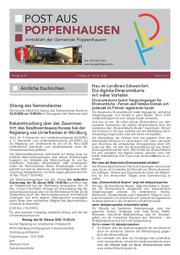 Ab 2025 erscheint die „Post aus Poppenhausen” 14-tägig in den geraden Kalenderwochen und wird immer freitags an die Haushalte aller Gemeindeteile kostenfrei verteilt.