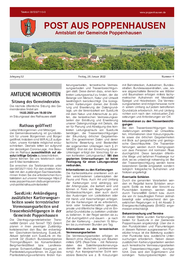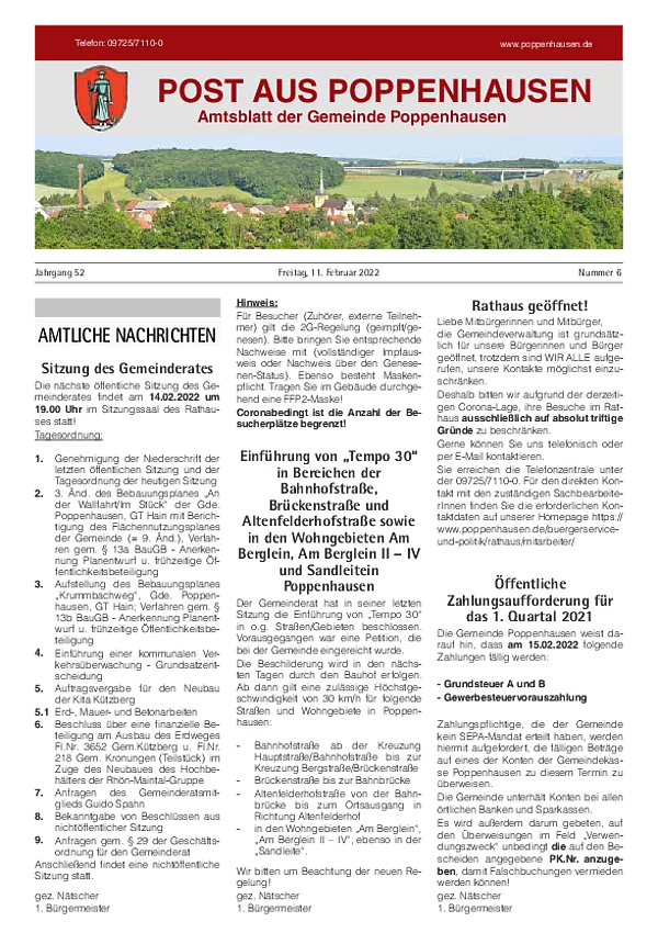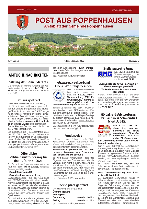 Liebe Bürgerinnen und Bürger, wir freuen uns über Ihr Interesse an unserem Amtsblatt der Gemeinde Poppenhausen.