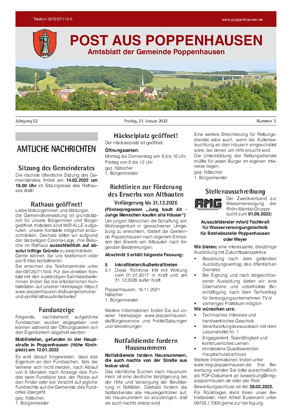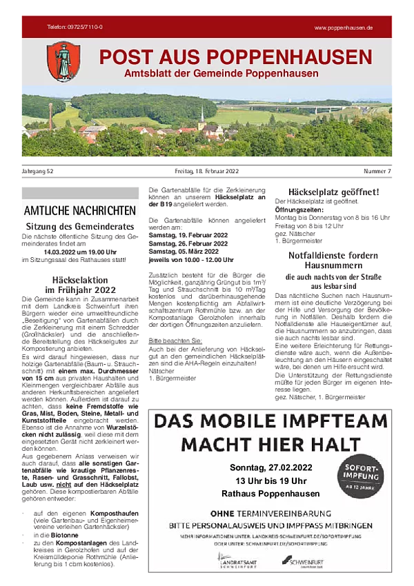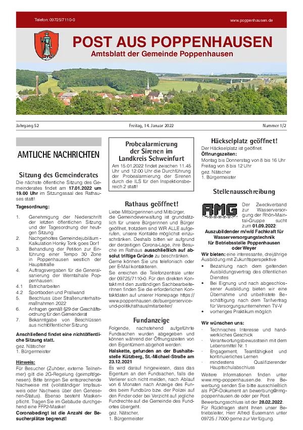 Ab 2025 erscheint die „Post aus Poppenhausen” 14-tägig in den geraden Kalenderwochen und wird immer freitags an die Haushalte aller Gemeindeteile kostenfrei verteilt.