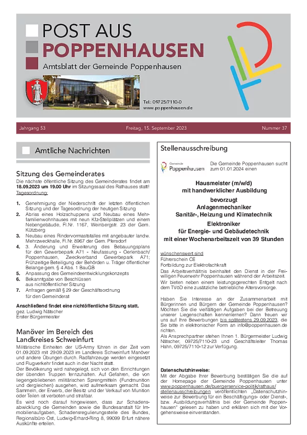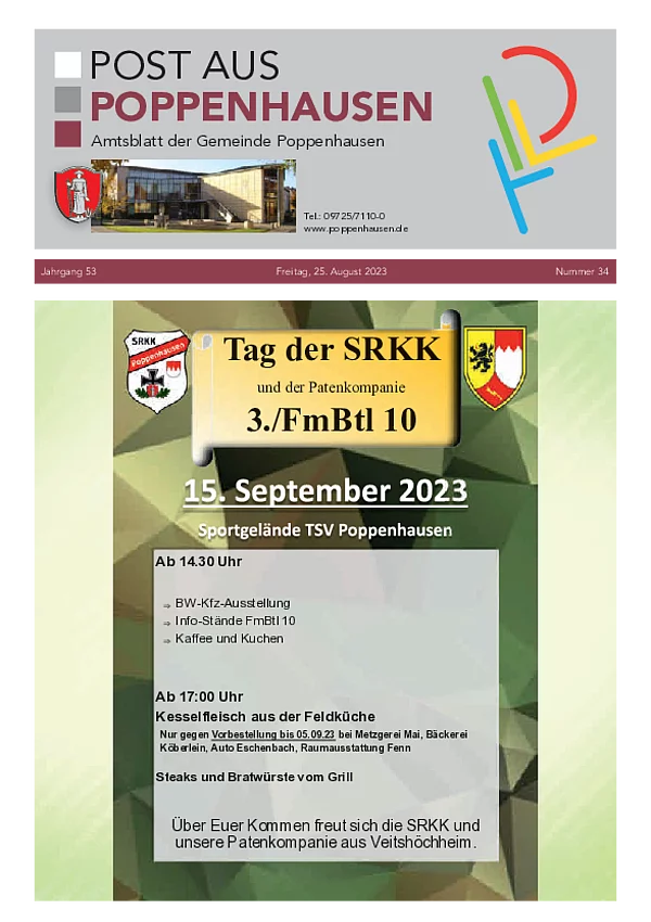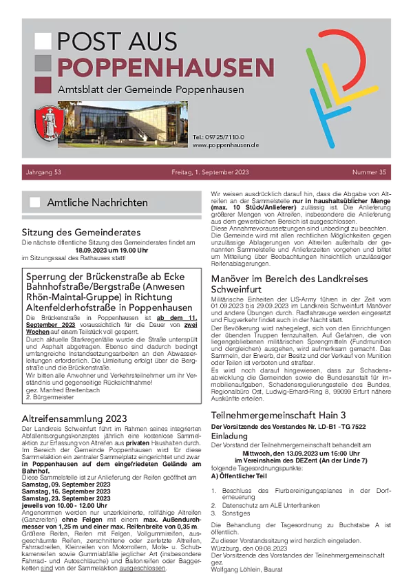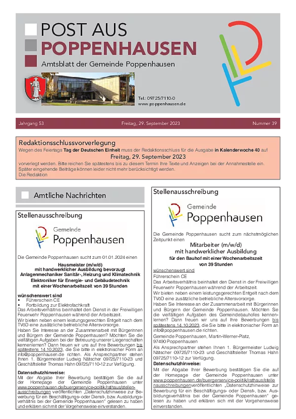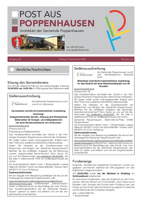 Ab 2025 erscheint die „Post aus Poppenhausen” 14-tägig in den geraden Kalenderwochen und wird immer freitags an die Haushalte aller Gemeindeteile kostenfrei verteilt.