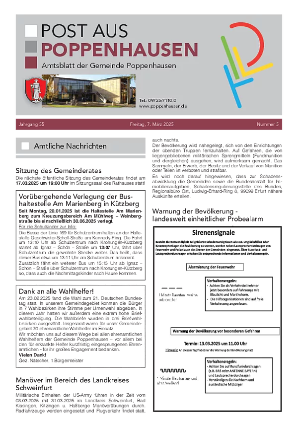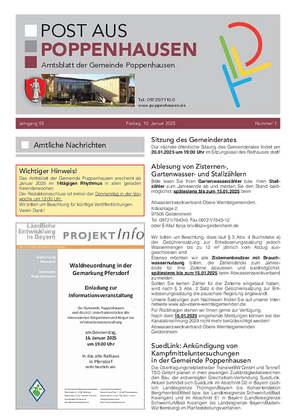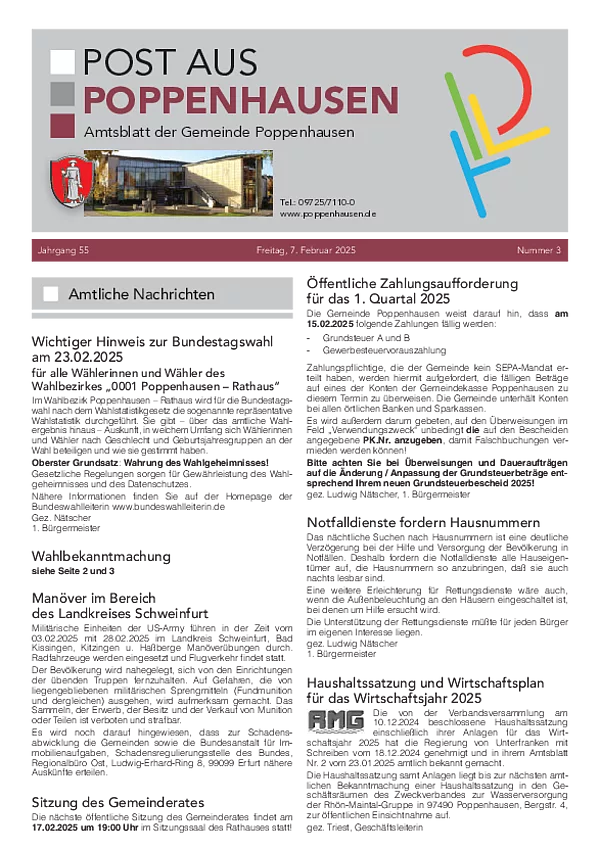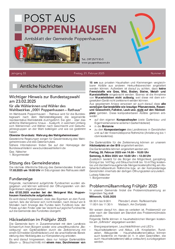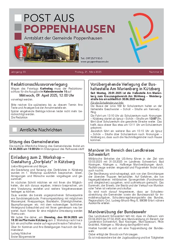 Ab 2025 erscheint die „Post aus Poppenhausen” 14-tägig in den geraden Kalenderwochen und wird immer freitags an die Haushalte aller Gemeindeteile kostenfrei verteilt.