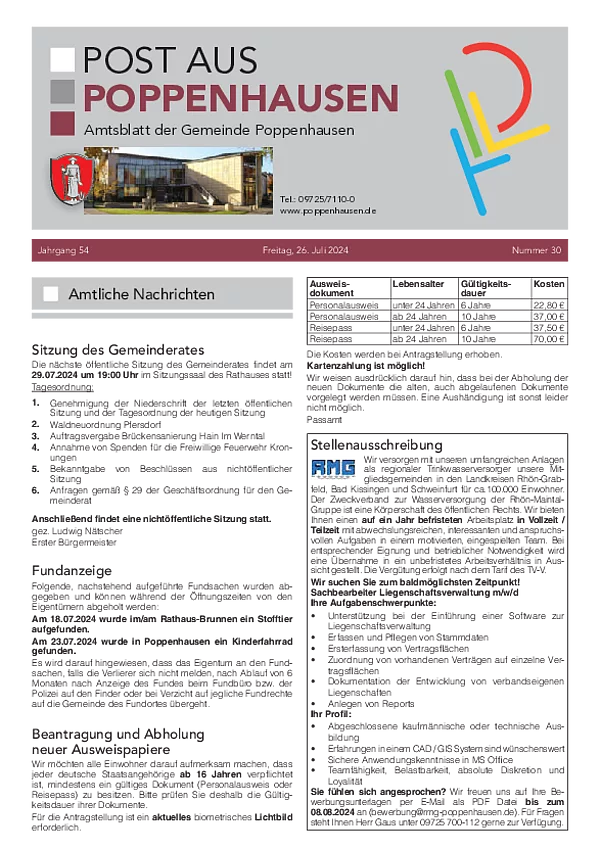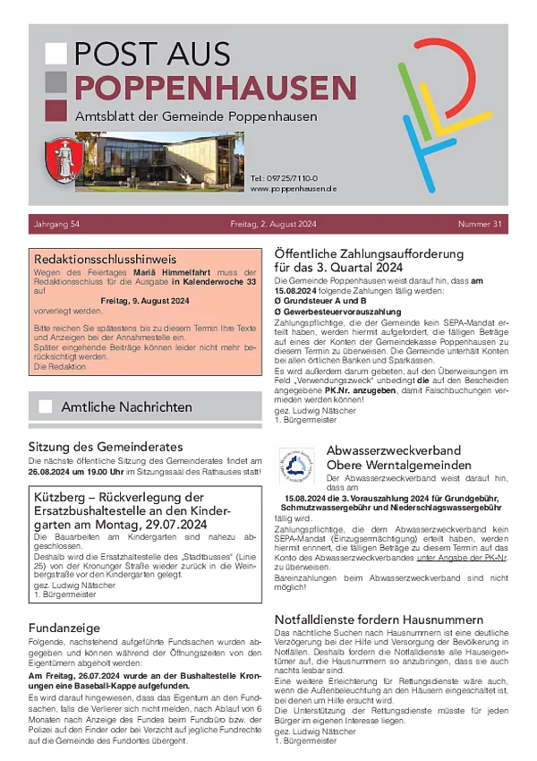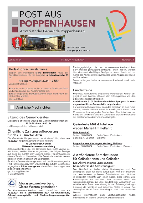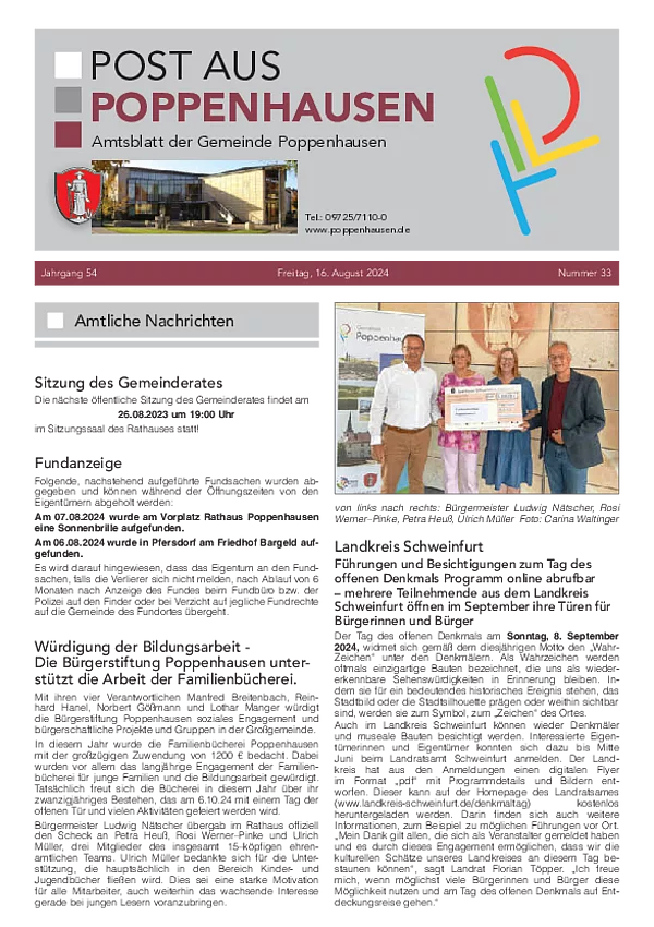 Ab 2025 erscheint die „Post aus Poppenhausen” 14-tägig in den geraden Kalenderwochen und wird immer freitags an die Haushalte aller Gemeindeteile kostenfrei verteilt.