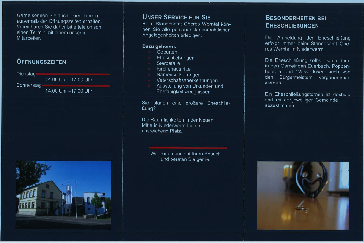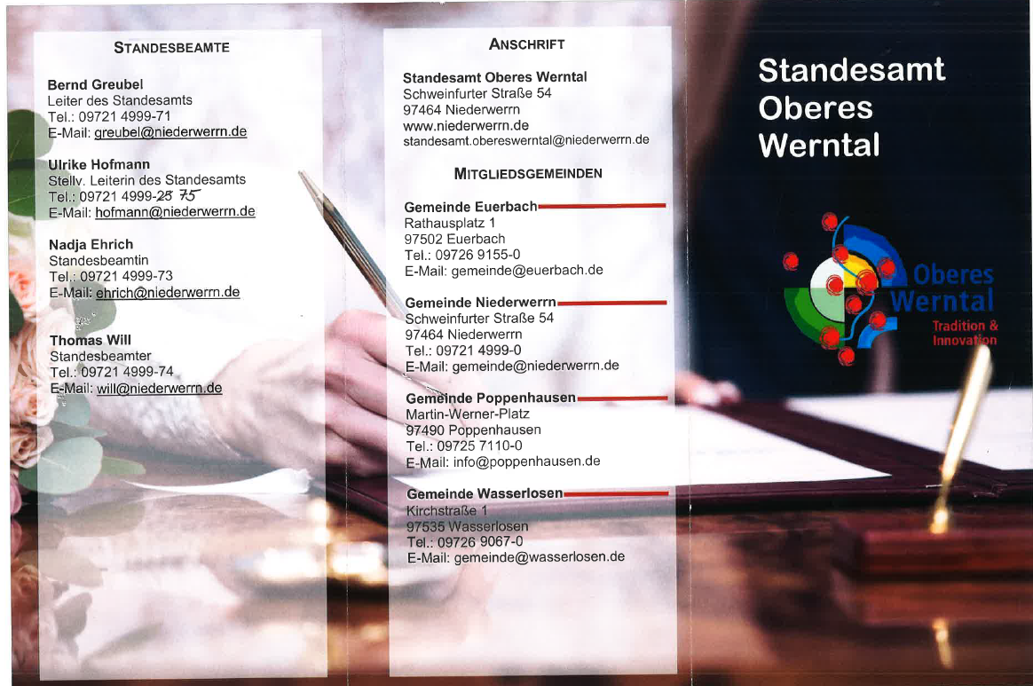 Die Öffnungszeiten des Standesamtes sind den Öffnungszeiten des Rathauses Niederwerrn angepasst. Informationen zum Standesamt "Oberes Werntal" finden Sie auf dem Flyer, der auch im Rathaus Poppenhausen ausliegt.