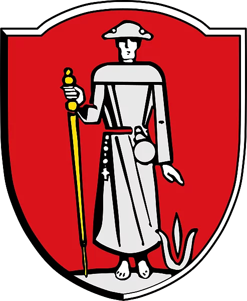 „In Rot auf silbernem Boden der silbern gekleidete barfüßige Hl. Jakobus mit Pilgerhut und Pilgerflasche, in der Rechten einen goldenen Pilgerstab haltend, links auf dem Boden eine silberne Pflanze”.
